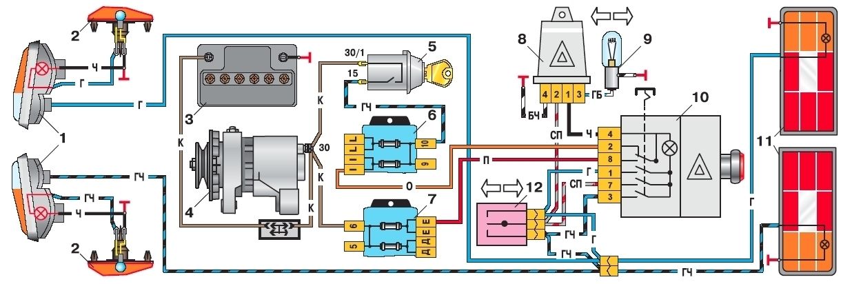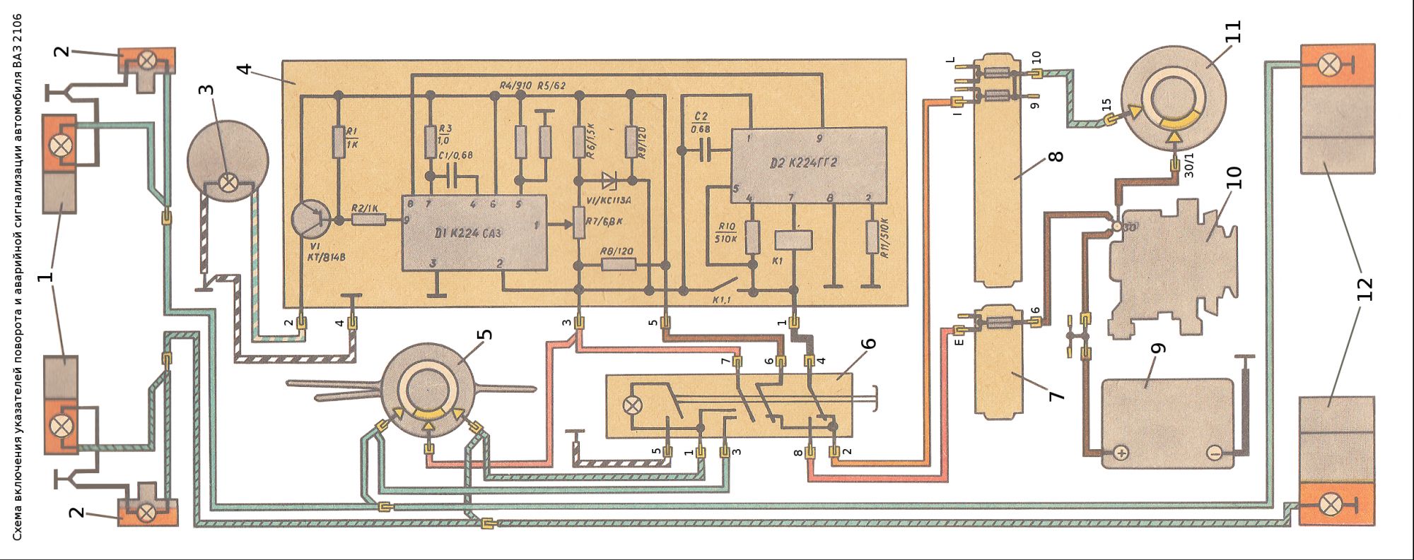 Так проблема в чём? Схемы однотипные, что 2106, что 2107. 1 контакт кнопки — левый поворот (или правый, без разницы), 2 — плюс от замка зажигания, 3 — второй поворот, 4 — выход питания на реле поворотов, 7 — центральный контакт переключателя поворотов, 8 — постоянный плюс. По цветам не скажу, мне проще по проводам найти.