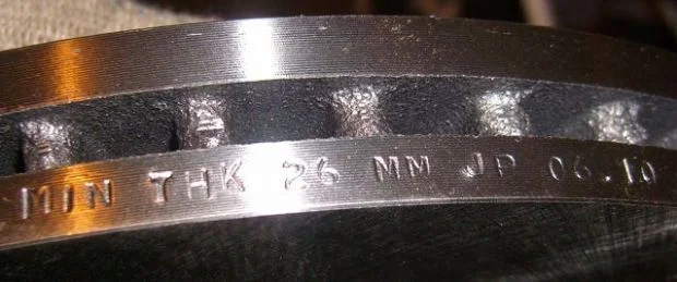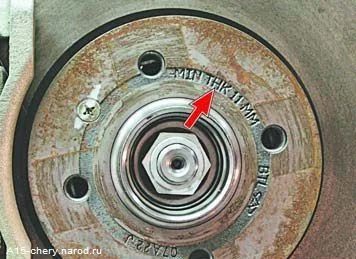 На торце диска, или спереди, выбита начальная толщина и минимально допустимая.