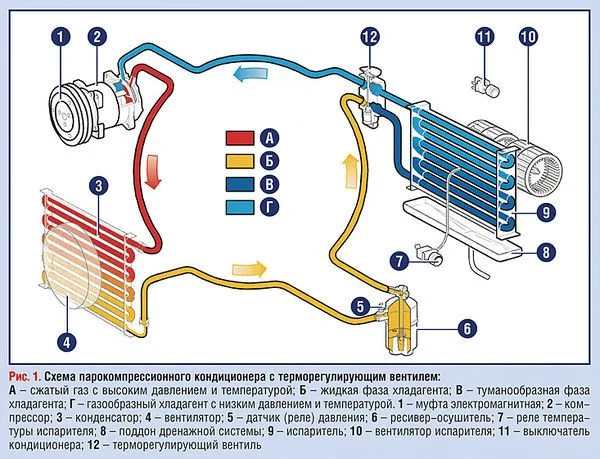 Или терморегулирующий вентиль неисправен №12 или реле температуры испарителя №7