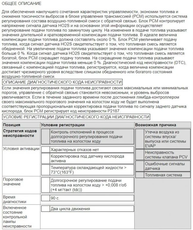 P2187 — бедная смесь на холостом ходу, причины описаны ниже.