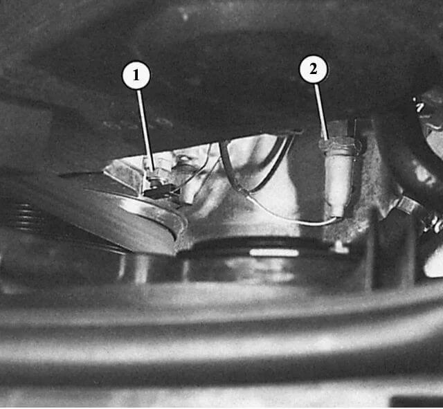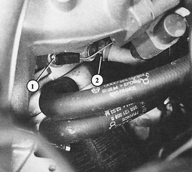 На шести цилиндровых двигателях ABC, AAH датчик стоит справа возле шкива коленвала, если смотреть со стороны приводного ремня(№2). Цвет изоляции датчика белый, давление срабатывания от 1.8 бар. Момент затяжки датчика 25 Нм. При установке необходимо новое уплотнительное кольцо.