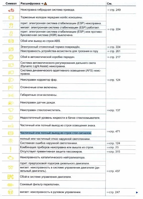 Этот значок означает — частичный или полный выход из строя стоп-сигналов. Проверьте горят ли лампы стоп сигналов, проблема может быть как в самих лампах, разъемах, проводах, так и в концевике педали тормоза.