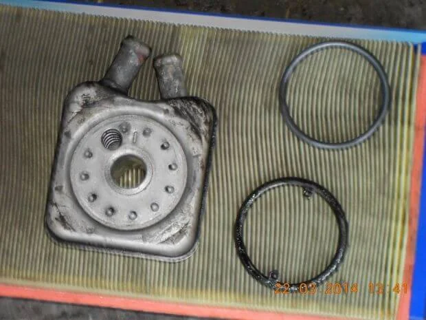 Снимал масляный радиатор, выпало резиновое кольцо, не пойму откуда,если можно схему установки прокладок.