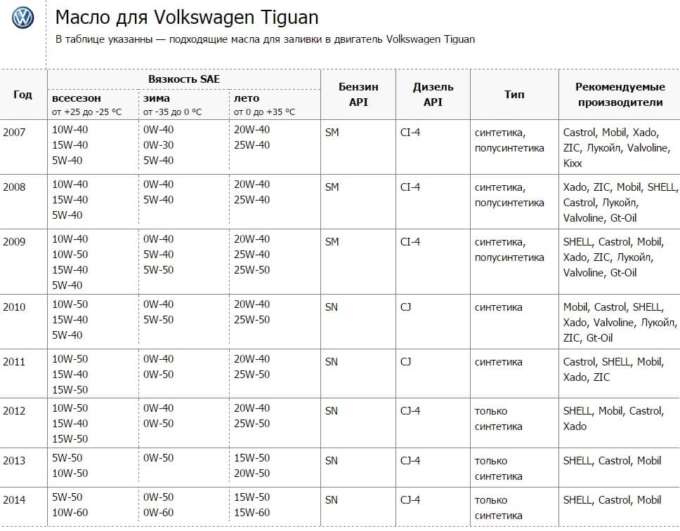 Выбрать подходящее масло для двигателя Фольксваген Тигуан можно взглянув на картинку выше.