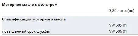 Объем масла 3,8 литра с учетом замены фильтра. Масло с допуском VW 505 01, VW 506 01.