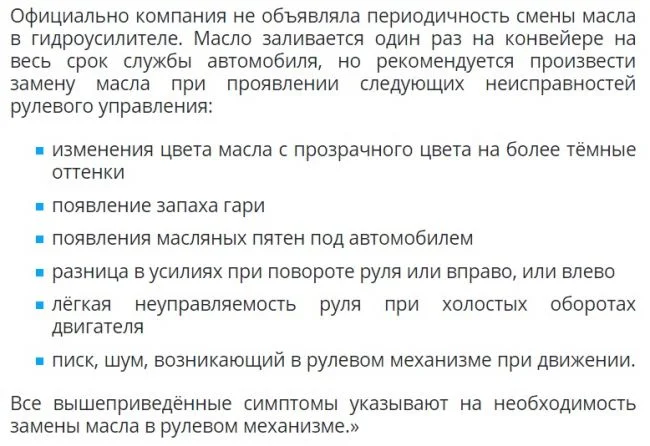 Здравствуйте! Машина прошла 150 000 км. Жидкость в бачке гидроусилителя не менялась. Какое масло, рекомендованное производителем, необходимо заливать?