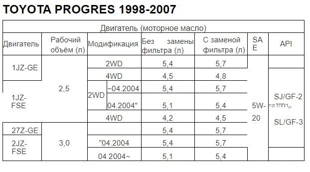 Какое масло в двигатель 1JZ-FSE Тойота Прогрес?