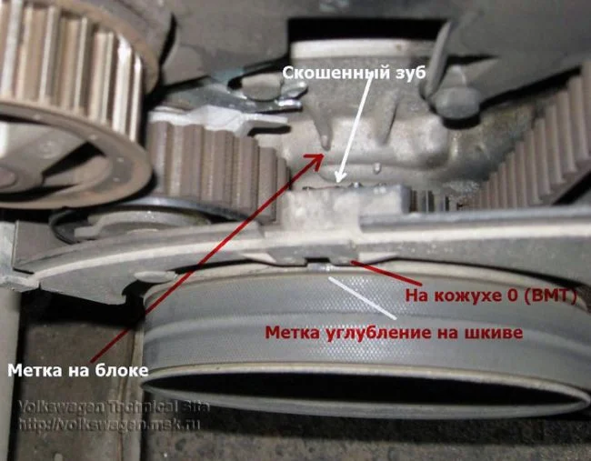 Для установки в ВМТ на зубчатой шестерне коленвала двигателя АЕХ есть скошенный зуб, который надо совместить с меткой на корпусе мотора. Проблема в том, что там есть ДВЕ метки с разницей примерно 10 — 12 мм. Вопрос, какая метка правильная, левая или правая?