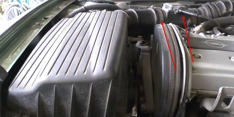Далее открутите хомут крепления патрубка от воздушного фильтра к дроссельной заслонке и сжав фиксатор, отключите разъем на ДМРВ.