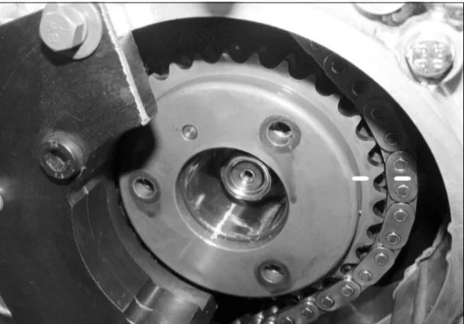 Вот выдержка из руководства по ремонту, на цепи должны быть цветные звенья. В руководстве указано, что нужно помечать метки на шестернях.