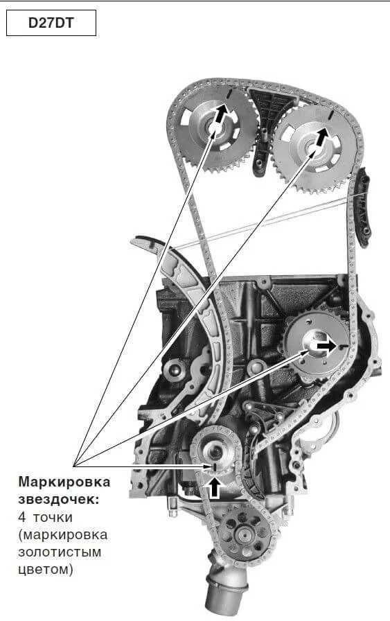 Здравствуйте, как выставить метки ГРМ на D27DT? После снятия ГБЦ не смог найти меток на цепи, которые окрашены. И вопрос по метке на шестерне ТНВД, как выставить?
