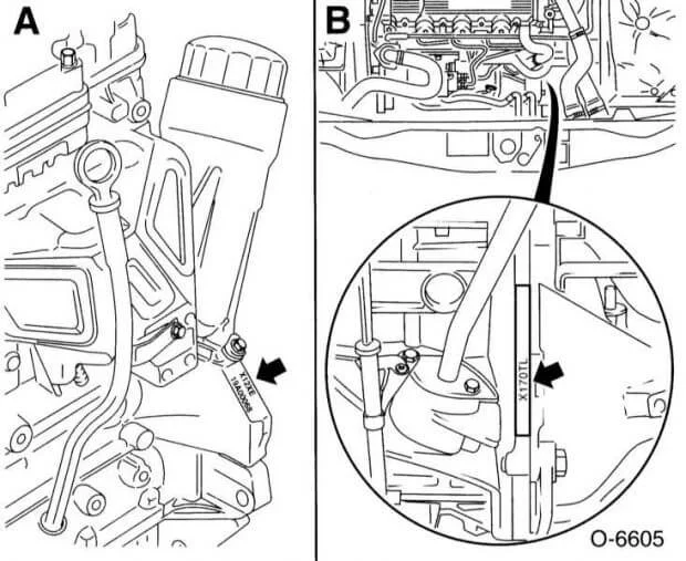 обозначение и номер двигателя на бензиновых моделях выбивается на левой стороне, а дизельном двигателе на правой стороне агрегата. А-бензин, В-дизель.