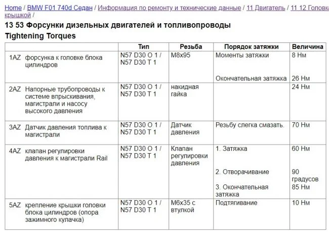 Какой момент затяжки болта форсунки БМВ 7 мотор N57?