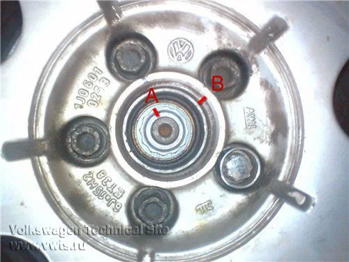 - Вторую метку -стрелка В- поставить на краю ступицы, как показано на рисунке.