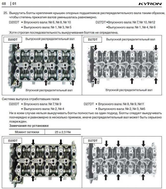 Порядок и моменты затяжки крышек распредвалов Ссанг Ёнг Кайрон d20dt