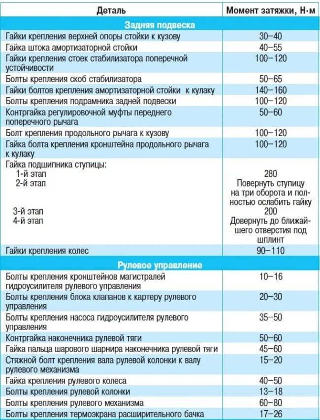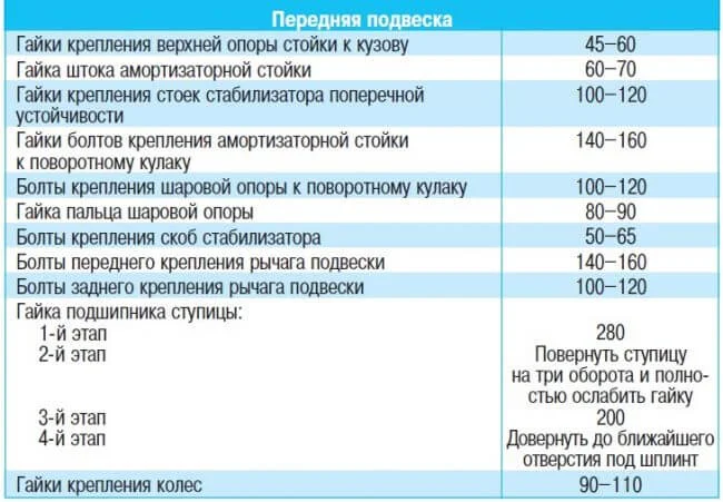 Здравствуйте, какие моменты затяжки передней и задней подвески + ступичного подшипника?