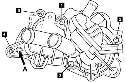 - в конце с усилием в 12 Нм затяните болты в последовательности — “A”, 3, 4, 5, 1, 2.