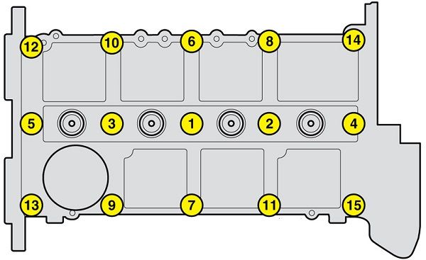 Направляющие нужны для того, чтобы не допустить смещения коромысел во время установки крышки ГБЦ. Обязательно следует убедиться в том, что коромысла располагаются правильно, а также что крышка внизу распределительного вала установлена на место. После этого можно вынимать направляющие и закручивать болты в порядке, который показан на картинке выше.
