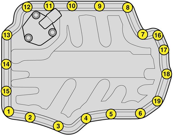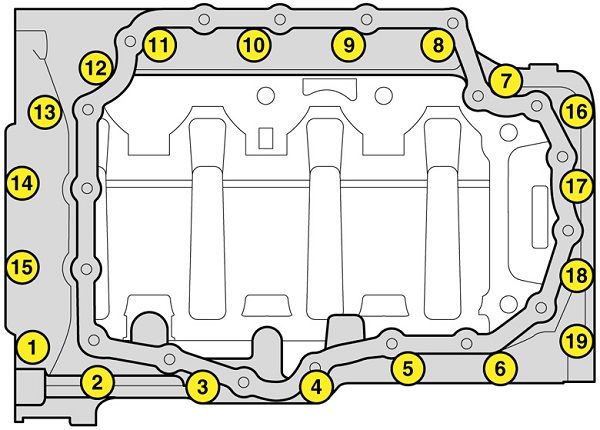 Пошаговая затяжка болтов нижней крышки поддона выглядит следующим образом: