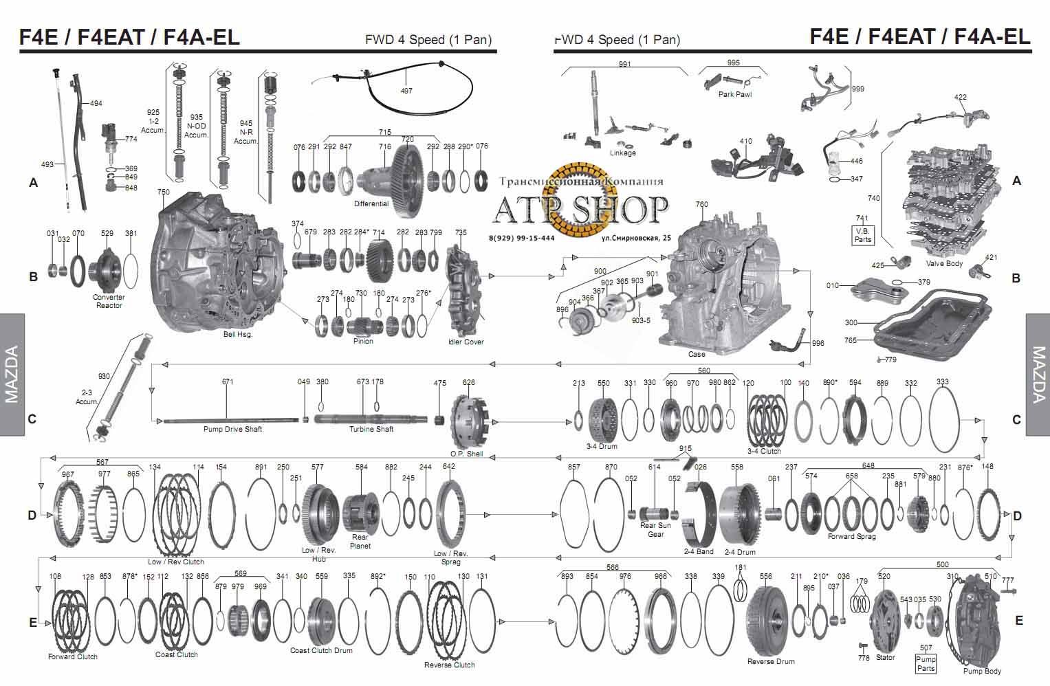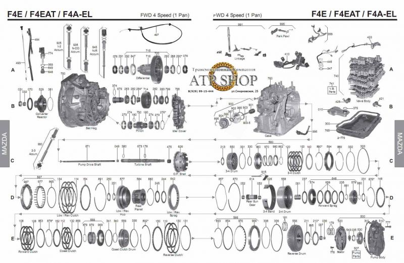 Схема АКПП, составляющие коробки F4А-EL (можно увеличить, кликнув на картинку)