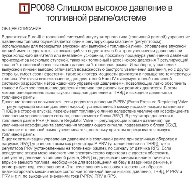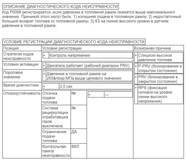 По ошибке P0087 подробно описано тут, по ошибке P0088 подробно описано ниже. Нужно проверить фактическое давление топлива, проблема может быть например в датчике давления, в его разъеме, проводах. Дилерский сканер предложит дальнейшие шаги для проверки, которые нужно провести.