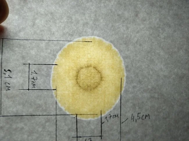 Здравствуйте. Провел капельный тест моторного масла, общий пробег 42800 км., на данном масле около 5000 км. Вроде, сама капля еще в норме, но меня беспокоит белая окантовка, вокруг пятна. Что это? Есть ли топливо в масле? Прикладываю фото на просвет. Заранее Вам благодарен.