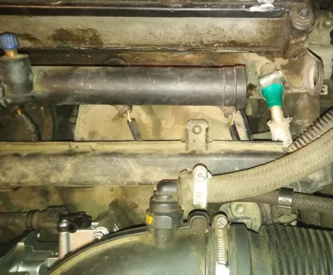 Здравствуйте! Сегодня проверял герметичность впускного коллектора и обнаружил утечку с металлической трубки, которая идет от головки блока(на фото зеленой изолентой обмотана). Уходит под впускной коллектор, не видно куда! Собственно вопрос, что за трубка и куда она идет? Проверял потому что двигатель сбоит на холодную! Спасибо за ответы!
