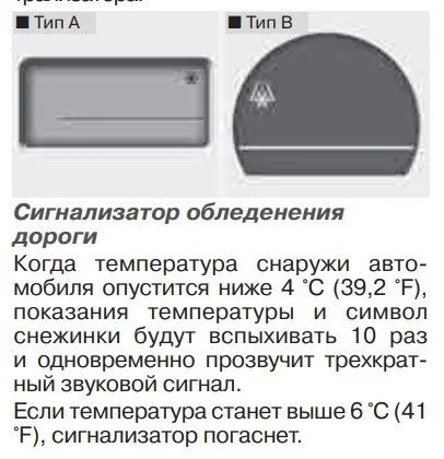 В инструкции написано, что при температуре ниже -4 звучит сигнал и несколько раз показывается температура. Потом гаснет. У меня значок «мороз»(автодорога со снежинкой) горит постоянно. Так должно быть? Ранее не замечал.