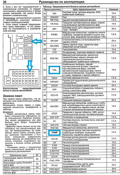 Также стоит проверить и предохранитель №43 “TAIL” 10А, если не загораются лампочки освещения багажника, подсветки номеров и некоторых других. Поскольку он отвечает за: