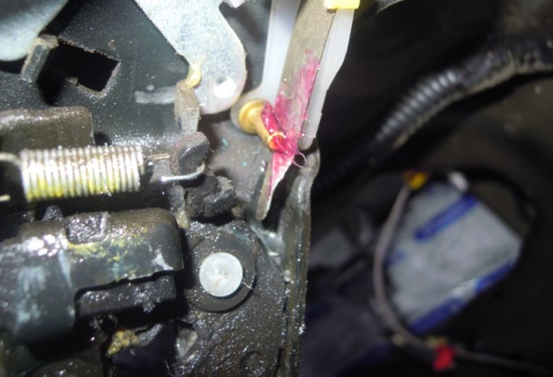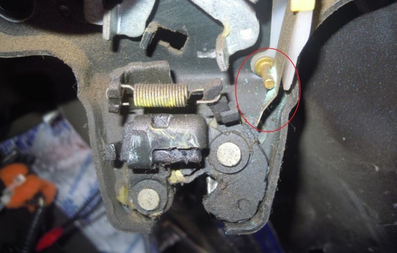 После этого откроется вид на механизм концевого выключателя освещения багажника. Выполнен данный выключатель в виде пластины, которая с одной стороны соединена с одним из выводов 3-контактного разъема. Вторая сторона этой пластины соединена с металлическим наконечником (небольшой штырек), запрессованным в корпусе замка. Он выполняет роль массы, а определить его легко - он желтого цвета (изготовлен скорее всего из латуни или бронзы).