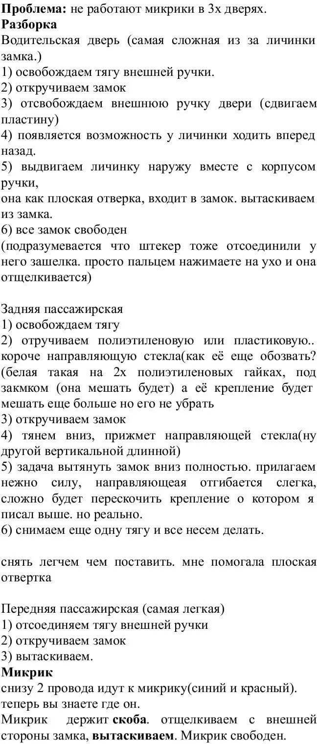 Болячка на поездивших машинах это концевики в дверных замках!!! если хочется цивильно – то ехать к дилеру и менять замки (механизмы) в дверях, если «не цивильно», то можно разобрать самому и либо пропаять микрухи (либо нарастить если стёрлись, либо поменять если контакта нет). Так же не исключается факт что возможно провода в дверях обломились. Или бывает глюки блока комфорта. По ремонту и модернизации концевика