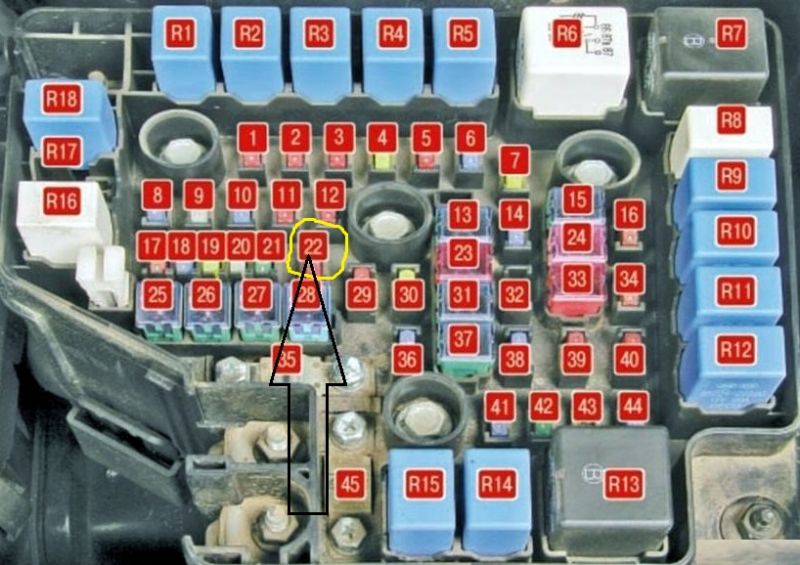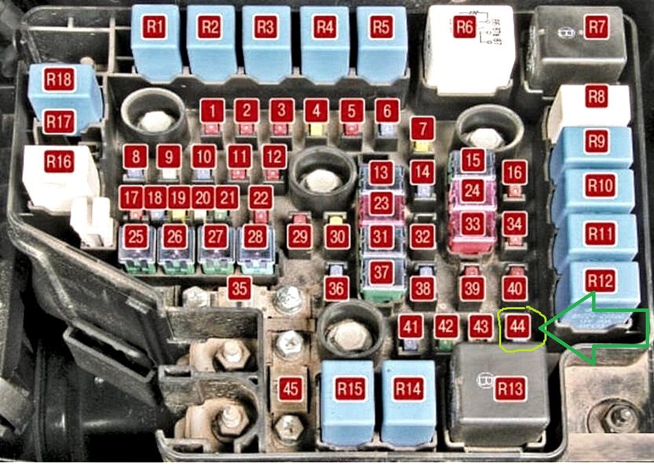 Если не загорается ближний свет правой фары, то проверьте предохранитель №44.
