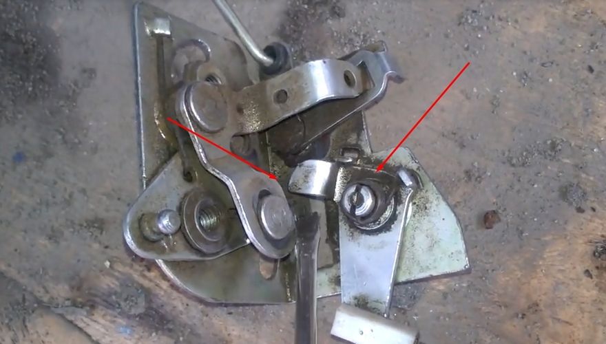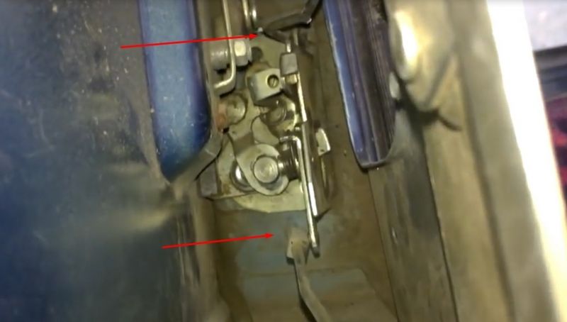Также хочу отметить еще один возможный вариант, когда г-образный рычаг перескакивает тягу и она в свою очередь не отжимает язычок открывания. В этом случае внутреннюю часть замка нужно менять. Ниже на фото отмечен рычаг и тяга.
