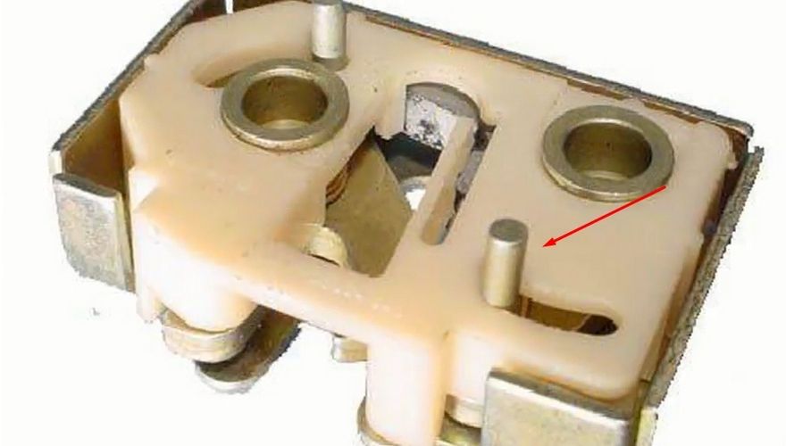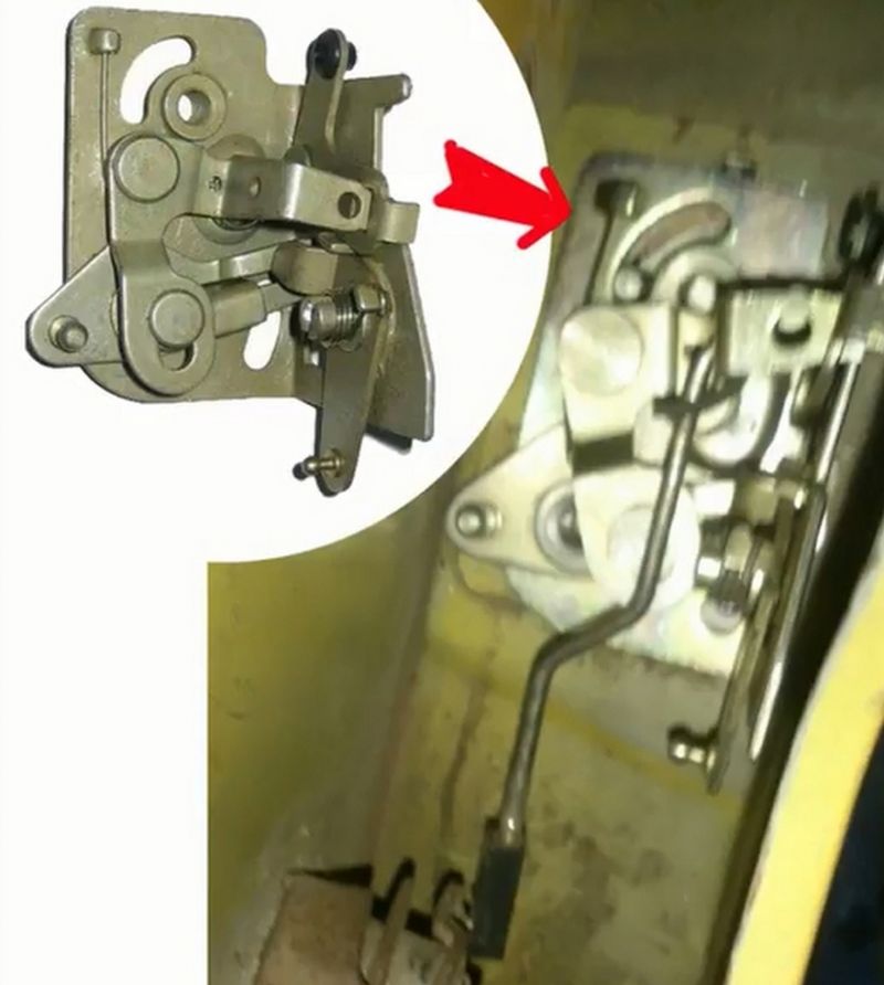 Посмотрите на внутреннюю часть замка и убедитесь, что верхняя и нижняя тяги стоят на месте. Если тяга соскочила, то можно попытаться ее одеть, если сломана, то только менять. Ниже на фото можно увидеть, как они должны стоять.