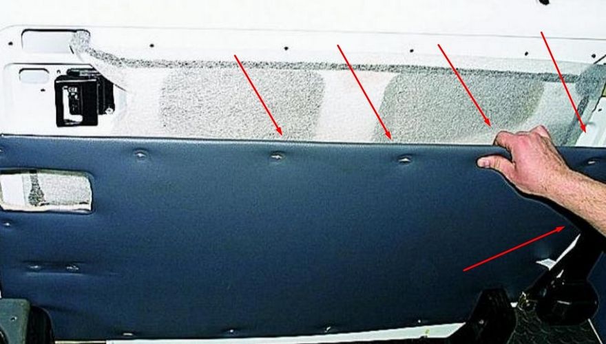 Если выше описанным способом не удалось открыть дверь, то перейдите в салон. Далее с помощью вилки (для снятия клипс) достаньте пять клипс крепежа обшивки и отведите ее на себя. Ниже на фото отмечено, какие клипсы нужно снять.