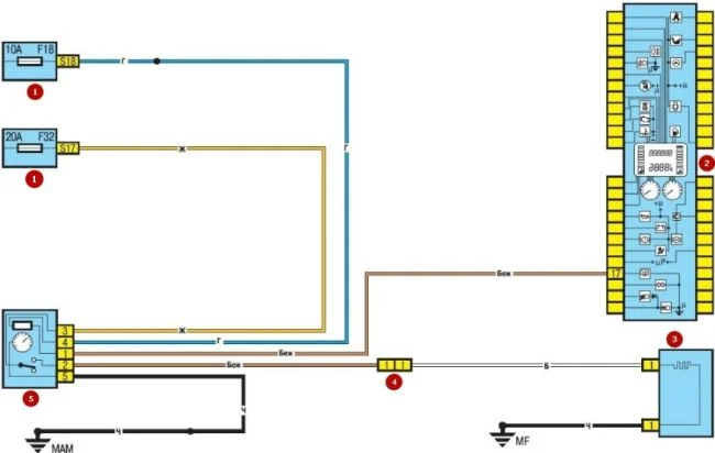 - F2 — приборная панель, обмотки реле К5 топливного насоса и катушки зажигания, система управления двигателем от замка зажигания (ЭБУ).