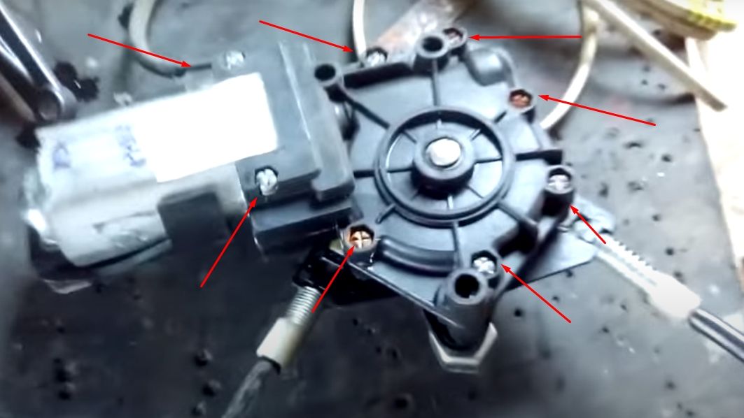 - Если после нажатия кнопки моторчик жужжит, но стекло не открывается, то проблема может быть в износе пластиковой шестерни редуктора. Ее можно заменить, открутив восемь винтов под крестовую отвертку и разобрав стеклоподъемник.