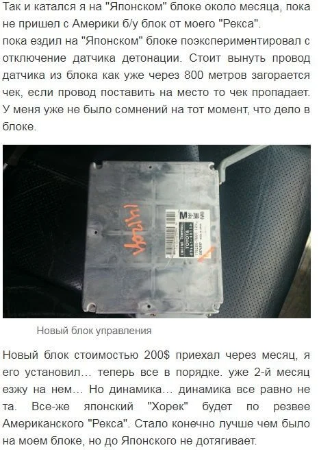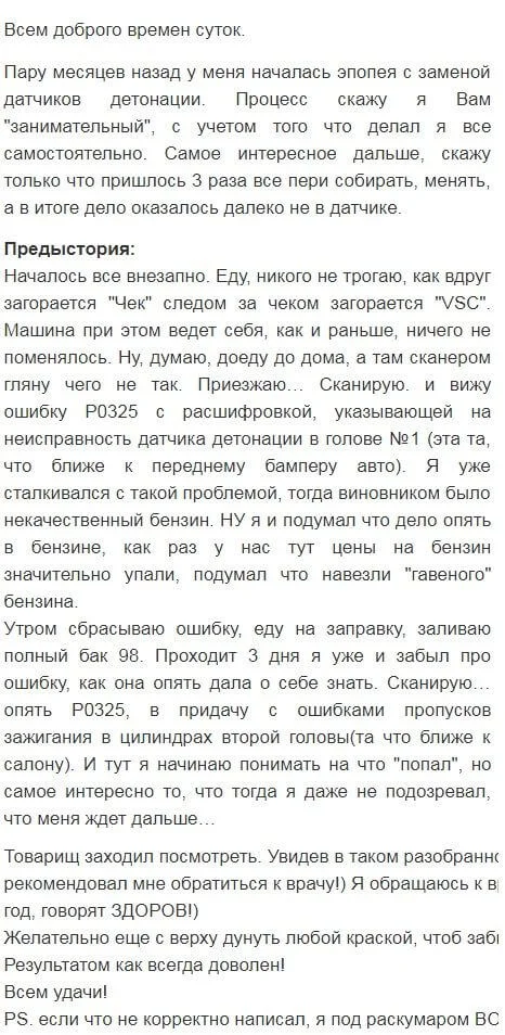 Проблема не исчезла, уже ставил и б/у датчики с работающих автомашин, и поменял ЭБУ. Ничего не помогает, несколько дней ездишь нормально, только на трассу выезжаешь, так загорается чек и показывает ошибку датчика детонации первой головки.