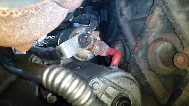 Если аккумулятор в порядке, тогда можно попытаться запустить мотор, перемкнув на стартере силовые болты: