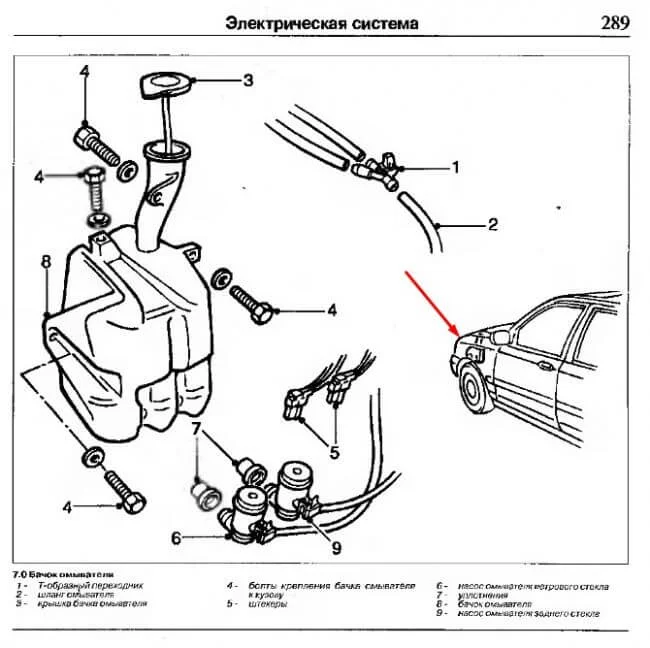 Бачок омывателя находится за подкрылком переднего правого колеса (добавил схему в первый ответ), на нем стоят два насоса (на лобовое и на заднее стекло), достаточно частично открутить подкрылок, насос держится на уплотнительной резинке.