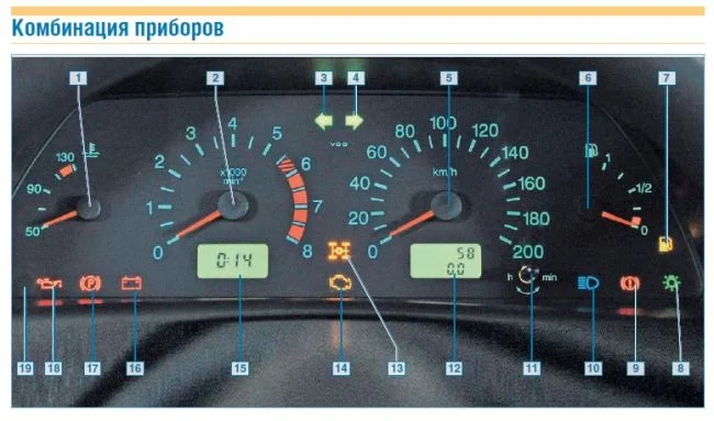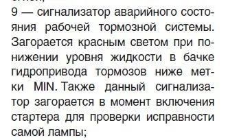 Если значок под №9, то это — сигнализатор аварийного состояния рабочей тормозной системы. Проверьте уровень тормозной жидкости, датчик уровня тормозной жидкости, его разъем и провода. Так же проверьте контакты разъема щитка приборов, контакты клемм аккумулятора. Проверьте еще горят ли стоп сигналы и свет в салоне (предохранитель на 7,5А).