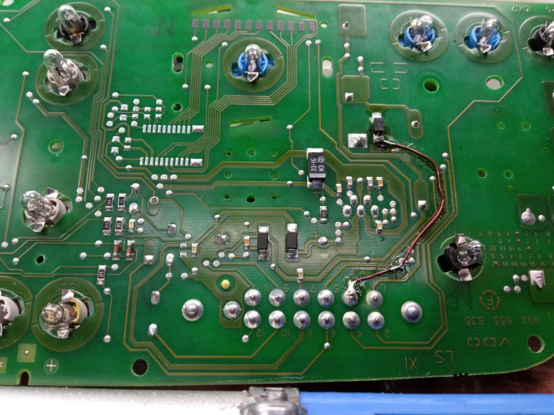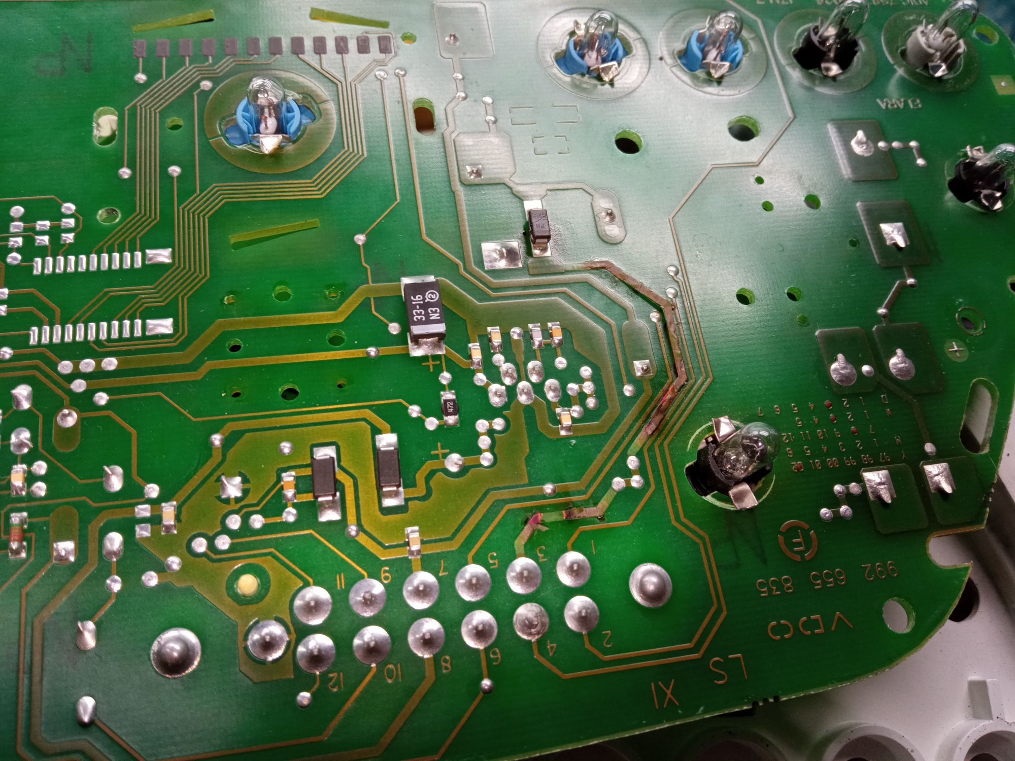 Вот, кстати, сегодняшний автомобиль, 2110, такие же симптомы. Щиток нового образца, обратная сторона платы. Сгорел диод, выгорела дорожка.