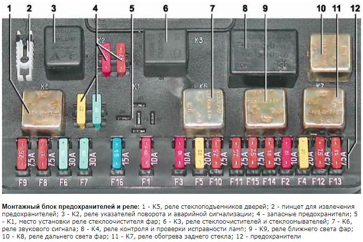 С помощью мультиметра проверьте питание на красно-белом проводе. При работе двигателя должно приходить постоянно 12 вольт. Если питания нет и при этом предохранитель F5 целый, то проблема в неисправности реле K6 или в контактах монтажного блока. Для того чтобы определить неисправность монтажного блока, отключите от него фишку возле реле и подайте на красно-белый провод 12В, если вентилятор сработал монтажный блок под замену. Ниже на фото отмечено место установки реле K6. Но часто все куда проще — отваливается от переокисления клемма (провода “+”) в монтажном блоке.