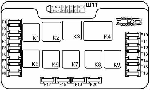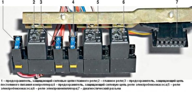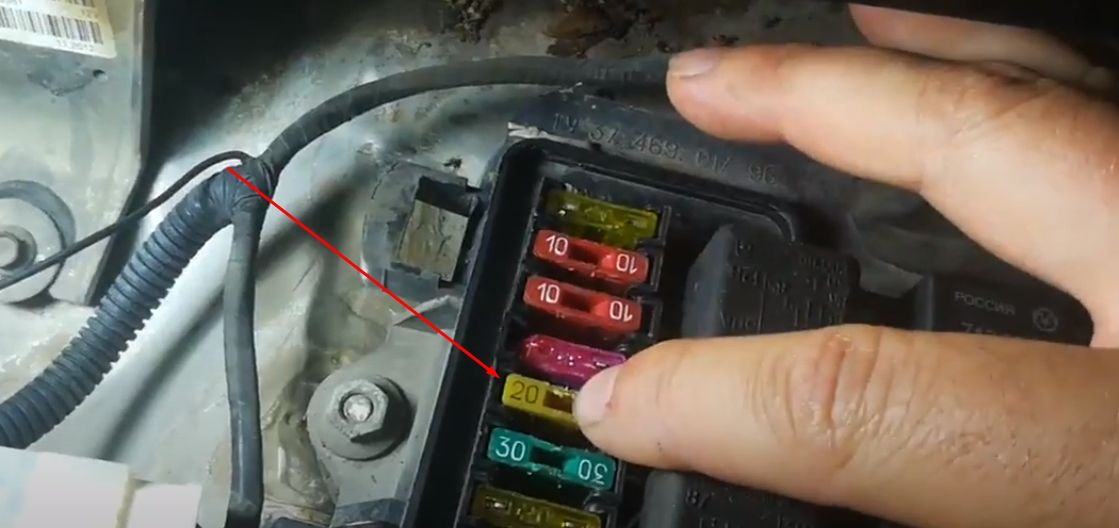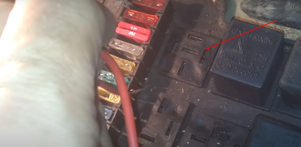 Если предохранитель на вентилятор целый, то нужно проверить предохранитель главного реле. Расположен он в салоне в районе левой ноги пассажира (для доступа к нему нужно снять пластиковую накладку). В блоке установлено три реле и в зависимости от года выпуска главное реле может стоять первым, вторым и третьим. Чаще всего оно стоит снизу. Ниже на фото отмечено главное реле и предохранитель.