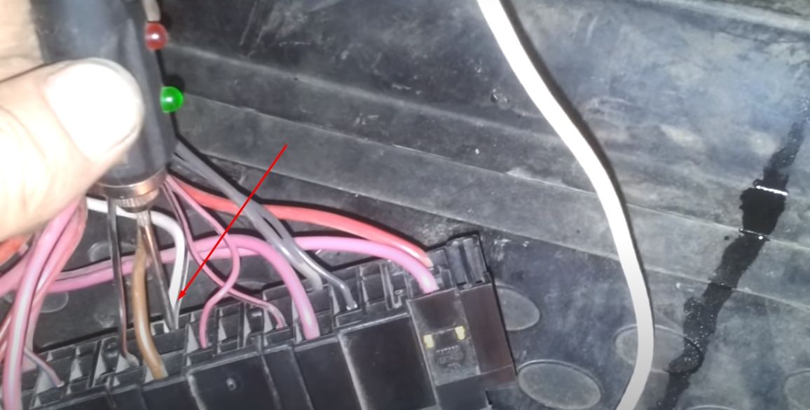 Далее прозвоните минусовой провод. Он идет к главному реле в салон автомобиля. Если провод не прозванивается, то смотрите его по косе, наверняка есть обрыв. Провод проходит возле чашки левого амортизатора и затем через моторный щит уходит в салон. Ниже на фото отмечен бело-черный провод приходящий к главному реле.
