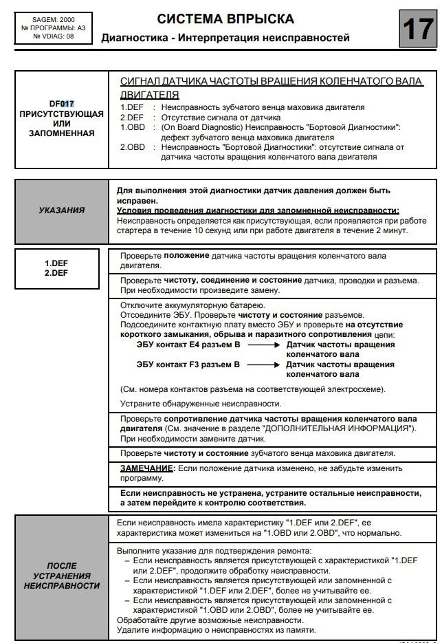 Нужно было провести проверки сканером Clip, которые он предложит. DF017 это ошибка по датчику коленвала, из-за этого и не запускается двигатель. Ниже приложено описание ошибок (в зависимости от двигателя) и что нужно проверить.