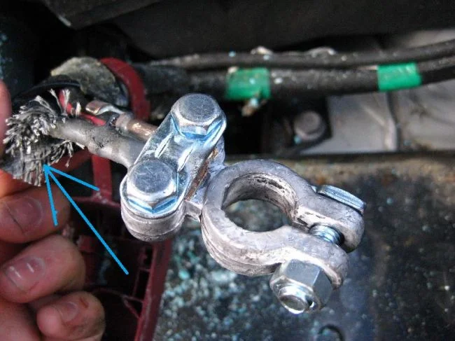 В этом случае, надо снять наконечники, очистить от окислов подручным инструментом, зачистить наждачной шкуркой. Конечно зачистить и клемму аккумулятора. Одеть наконечник на клемму и обязательно подтянуть болтик ключом. А то, многие просто набрасывают наконечник на клемму без затяжки болта, а это ослабление контакта, возрастание сопротивления и как результат — слабо крутит стартер.