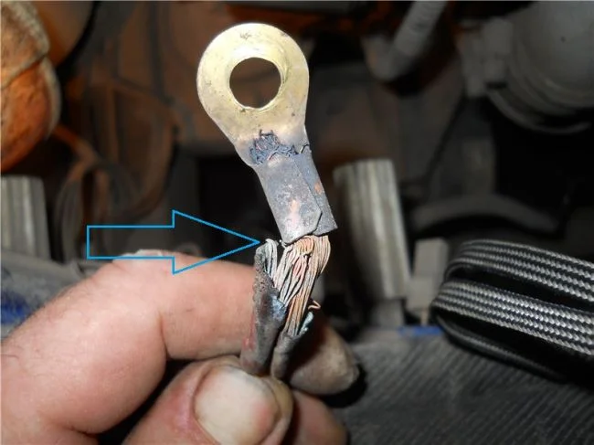 Обратите внимание и на соединение провода с наконечником, бывает в этом месте переламывается провод. Он там многожильный, в процессе эксплуатации автомобиля, там в жгуте бывает отламывается один проводок, потом второй, третий, десятый, и вот уже жгут стал тонким проводом, это возрастание сопротивления, нагрев провода и как результат нехватка тока для стартера, будет стартер прокручивать с трудом