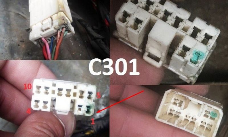 Отключите разъем С301 и осмотрите его. В моем случае прогнил контакт под номером один как раз отвечающий за питание ЭБУ. Контакт нужно вынуть из разъема, припаять новый и собрать все обратно. После подключения разъема бензонасос должен заработать, появится значок “чек” и автомобиль запустится.