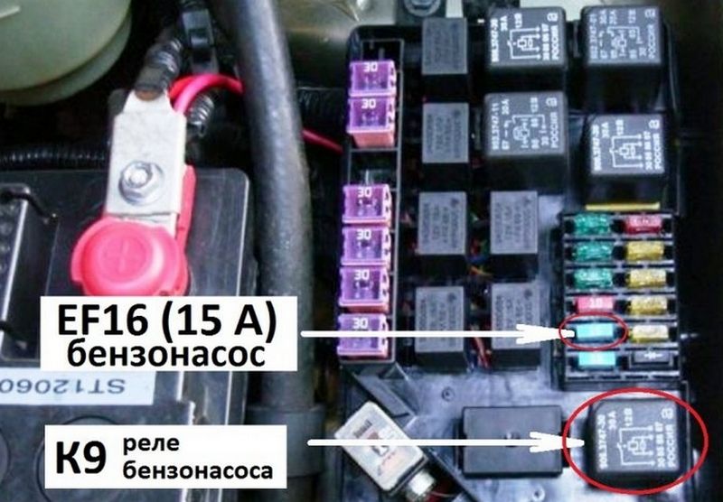 Если у вас все в порядке с разъемом С301, то вероятно у вас обрыв в цепи питания бензонасоса или сгорел сам насос. Для начала нужно проверить предохранитель EF16(15А). Вы пишите, что проверили предохранители, но рекомендую посмотреть еще раз. Бывают случаи, когда предохранитель трескается, с виду он как бы целый, а ток не пропускает. Также обратите внимание, на контакты предохранителя они должны быть не окисленные и не оплавленные. Ниже на фото отмечен предохранитель и реле бензонасоса.